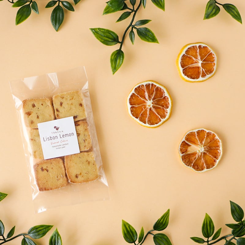 小麦粉(国産)、リスボンレモンピール(愛知県産リスボンレモン、北海道産ビートグラニュー糖)、粉糖、バター、マーガリン、アーモンドパウダー、卵黄、塩